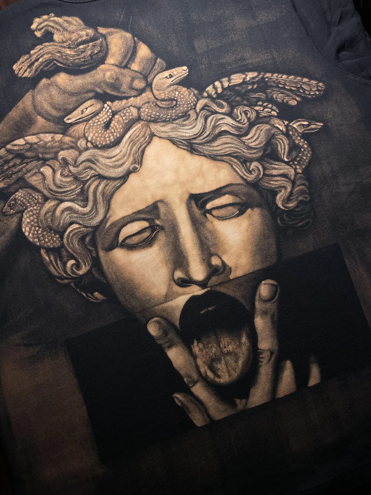 Das Medusa Gorgone Statue Bleach Art T-Shirt ist ein handgebleichtes Baumwoll-T-Shirt mit einer kraftvollen Medusa-Gorgone-Illustration, inspiriert von klassischen Steinskulpturen. Das Artwork erstreckt sich über die gesamte Rückseite des T-Shirts und verleiht der Figur eine monumentale, skulpturale Wirkung mit Bezug zur antiken Mythologie. Die Illustration wird mit einer handgemachten Bleach-Art-Technik erstellt, wodurch starke Kontraste, steinartige Texturen und ausdrucksstarke Details direkt aus dem Stoff entstehen. Im Gegensatz zu gedruckten Motiven wird das Artwork Teil des Materials selbst und erhält einen authentischen, künstlerischen Charakter. Das T-Shirt besteht aus 100 % Baumwolle von Uniqlo und bietet hohe Stoffqualität, Langlebigkeit und angenehmen Tragekomfort. Der Unisex-Schnitt in US-Größe XL sorgt für eine entspannte Passform. Auf der Vorderseite befindet sich das Helen Oben Art Logo, dezent platziert, um das markante Rückseitenmotiv auszugleichen. Da jedes T-Shirt einzeln von Hand gebleicht wird, können leichte Unterschiede in Farbton und Details auftreten. Dadurch ist jedes Stück ein Unikat. Dieses Medusa-T-Shirt ist ideal für Liebhaber von griechischer Mythologie, klassischer Kunst, dunkler Ästhetik und handgefertigter Wearable Art.