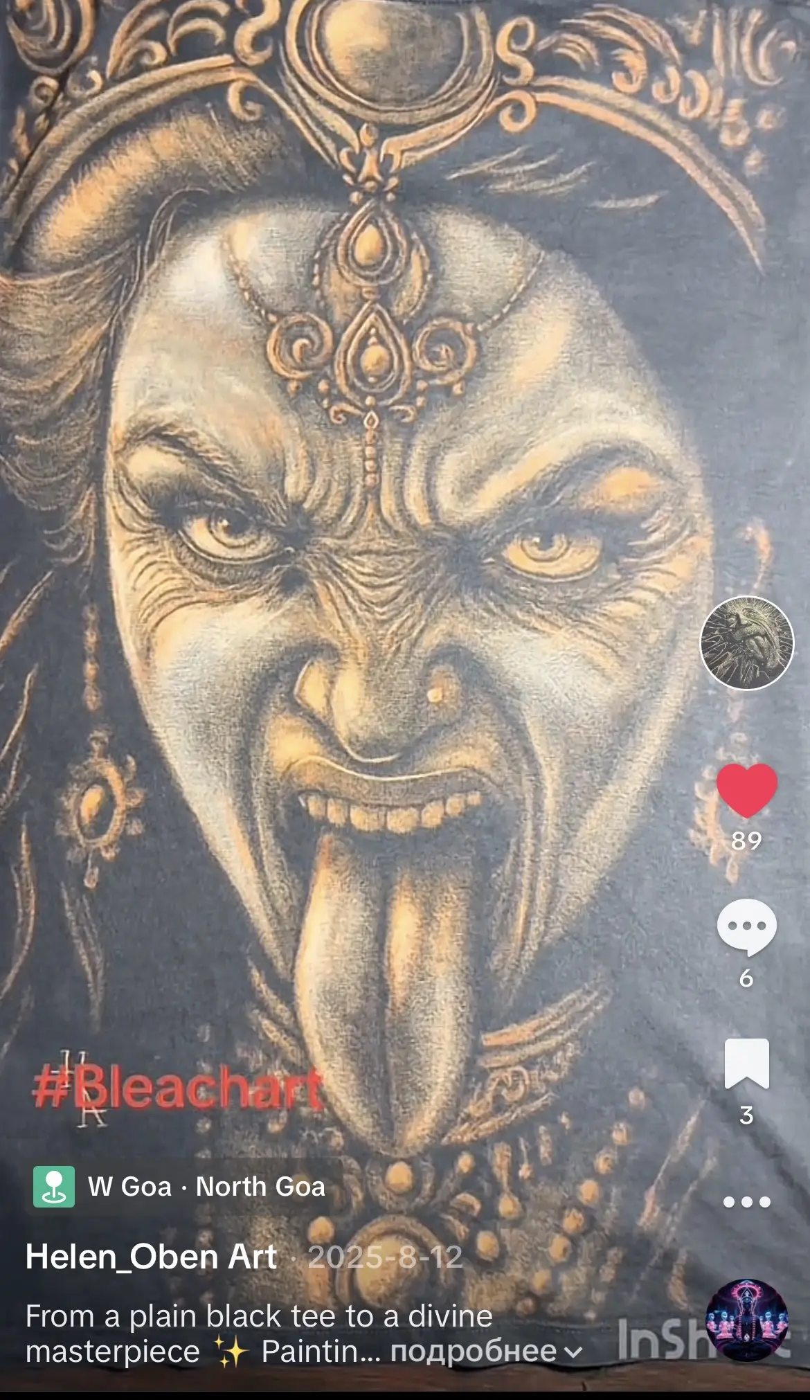TikTok screenshot featuring a bleach art t-shirt inspired by an Indian goddess