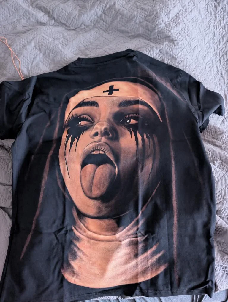 Customer photo of a newly received hand-painted t-shirt featuring a rebellious nun design with tongue out