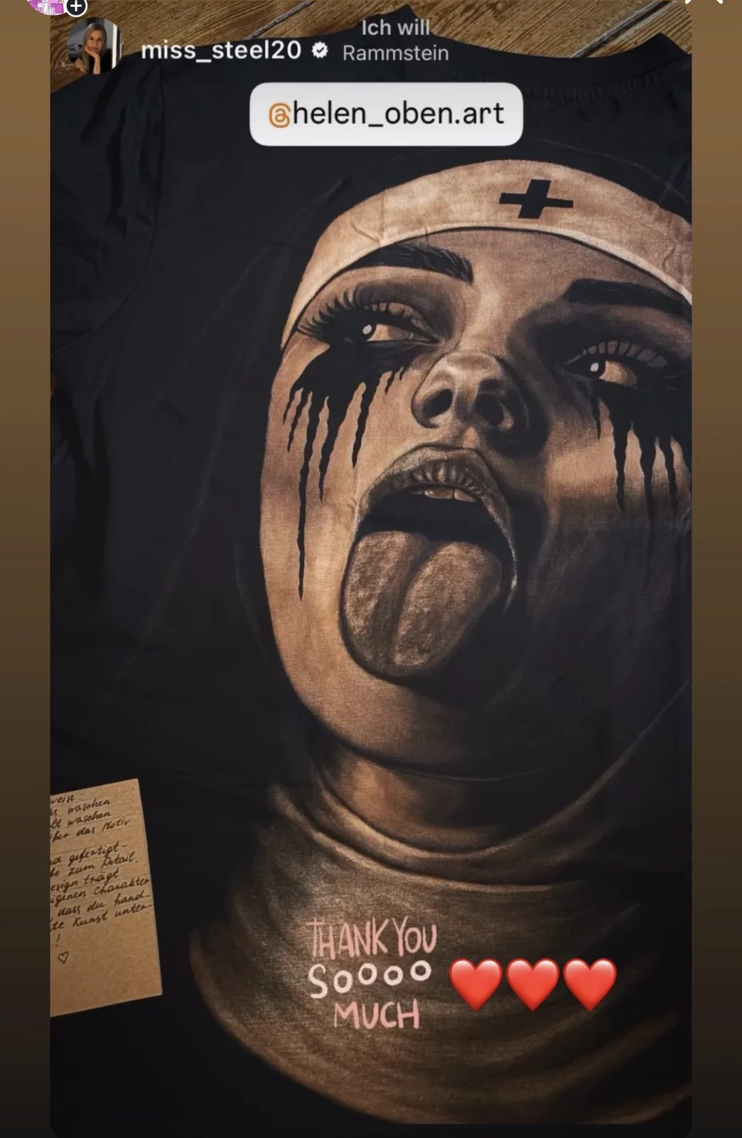 Screenshot of an Instagram story showing a customer who received a second version of a hand-painted t-shirt with a rebellious nun design