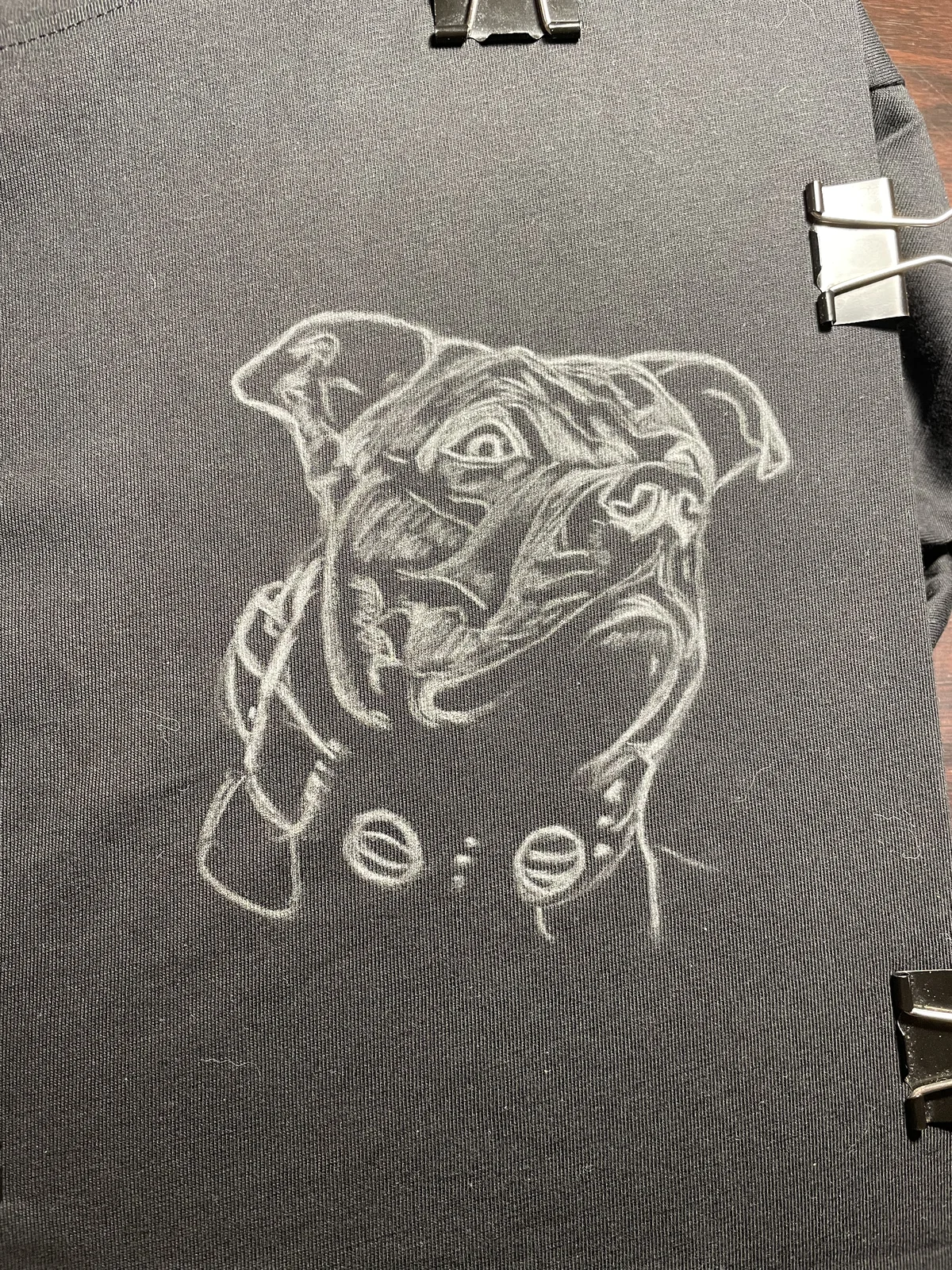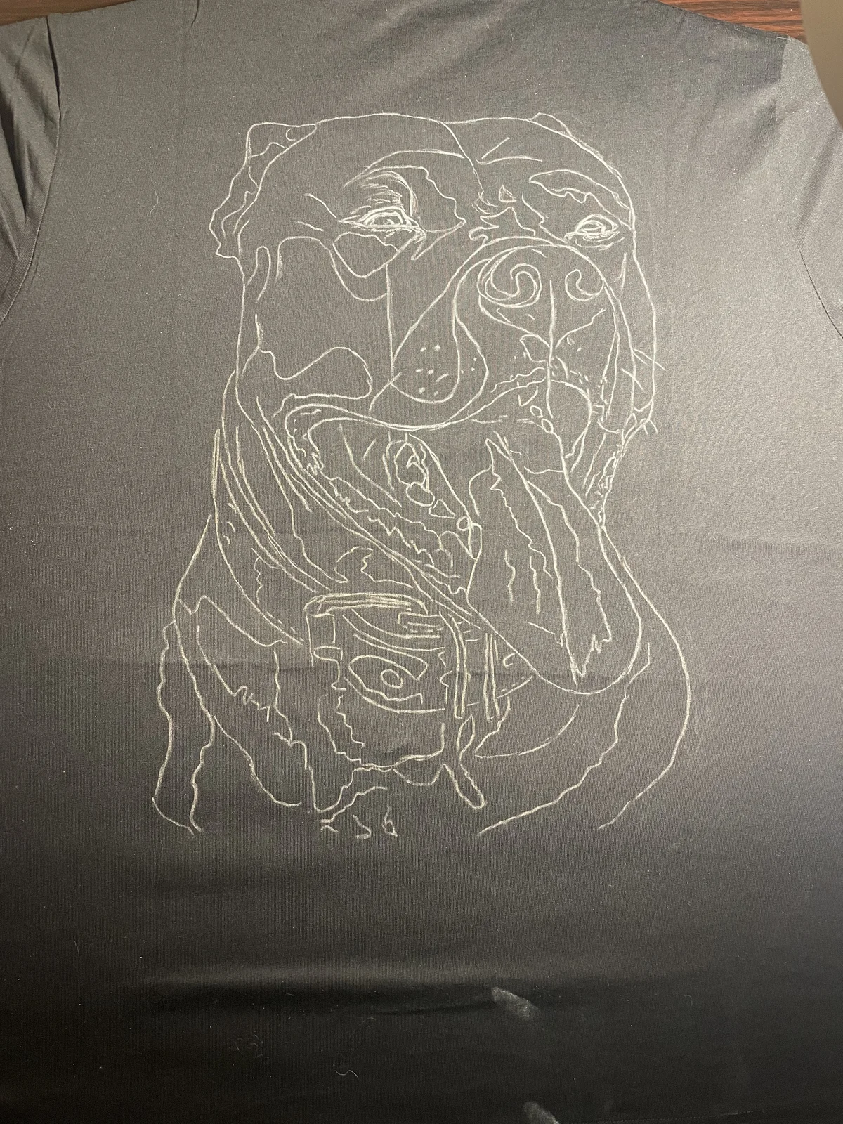 This hand painted T-shirt features a detailed portrait of an American Staffordshire Terrier on the back, covering most of the upper area. The artwork is created by hand directly on black cotton fabric using controlled bleach art and textile painting techniques, resulting in strong contrast and expressive detail. On the front, a smaller portrait of the same dog is painted over the heart area, adding a personal and symbolic touch. At the lower front side of the shirt, the subtle Helen Oben Art logo is hand painted to complete the composition. Each T-shirt is individually hand painted, making every piece unique. This is not printed clothing — it is wearable art created with care and attention to detail. Perfect for those who appreciate strong dog breeds, loyalty symbolism, and hand crafted clothing. Details: • Hand painted T-shirt • American Staffordshire Terrier portrait on the back • Mini portrait over the heart on the front • Helen Oben Art logo on lower front side • Black cotton fabric • Size: XL • One-of-a-kind piece