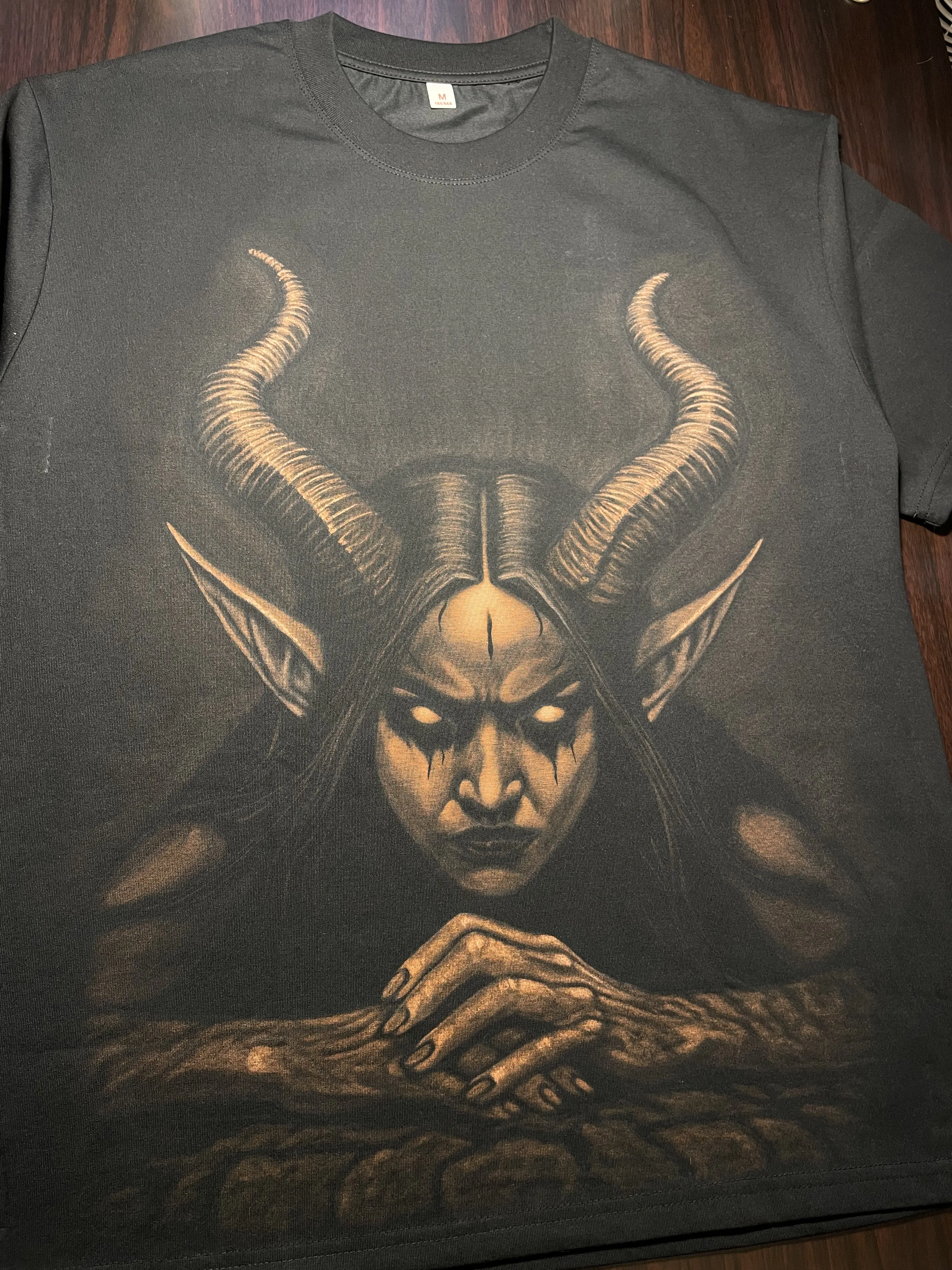 The Demon Woman Bleach Art T-Shirt is a hand-bleached cotton t-shirt featuring a powerful female demon artwork with horns, placed on the front of the t-shirt. The design highlights strength, dark beauty, and fantasy symbolism, creating a bold statement piece inspired by dark fantasy and gothic art. Created using a bleach art technique, the artwork has strong contrast, expressive details, and a raw handcrafted character that cannot be replicated by standard printing. The back of the t-shirt remains clean and minimal, allowing the front artwork to fully stand out. Made from 100% cotton (270 gsm), this t-shirt is durable, soft, and comfortable for everyday wear. The unisex fit and US size M provide a relaxed silhouette suitable for statement styling. Because each piece is hand-bleached, slight variations in tones and details may occur. This makes every t-shirt visually unique. This demon woman t-shirt is perfect for fans of dark fantasy fashion, female demon art, and handcrafted alternative clothing. Key features: • Hand-bleached demon woman artwork with horns on the front • Clean back design • 100% cotton, 270 gsm • Unisex fit, US size M • Handmade bleach art technique • Each piece may slightly vary