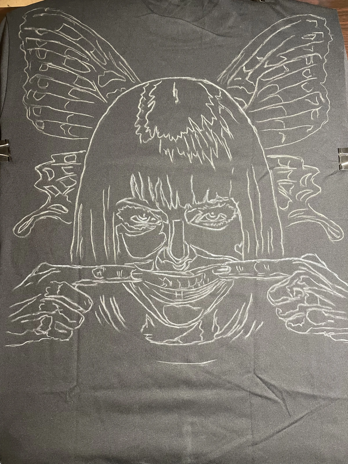 Distorted Smile Girl with Butterfly Wings – Hand-Painted Bleach Art T-Shirt