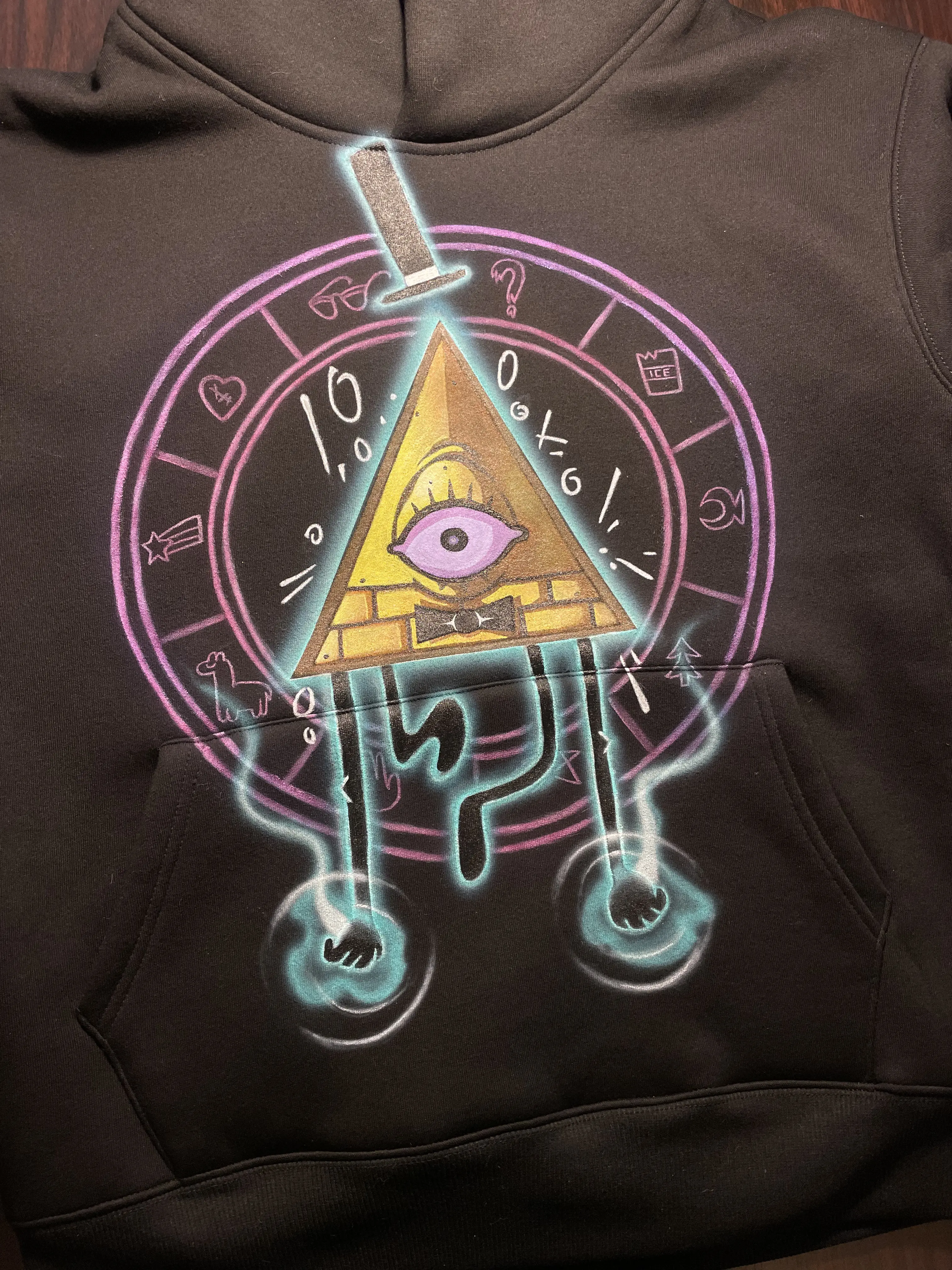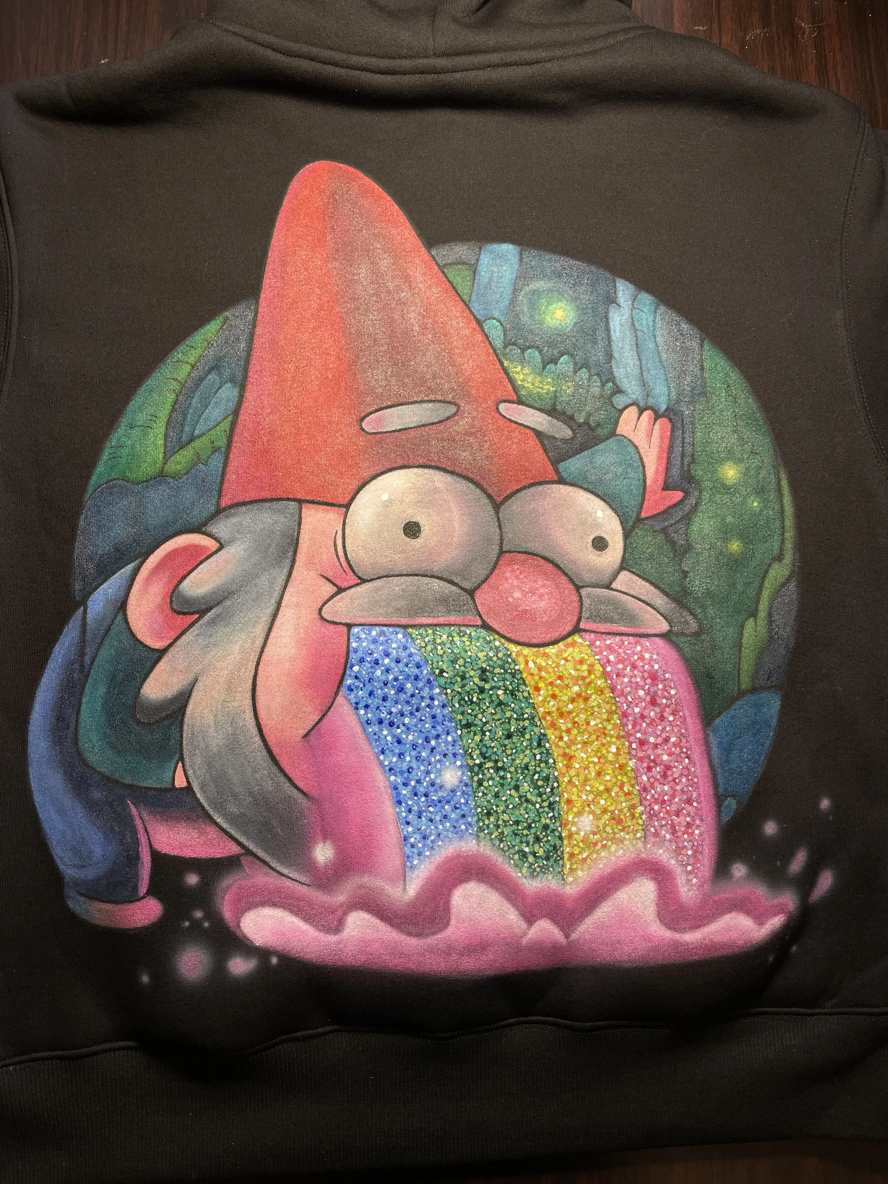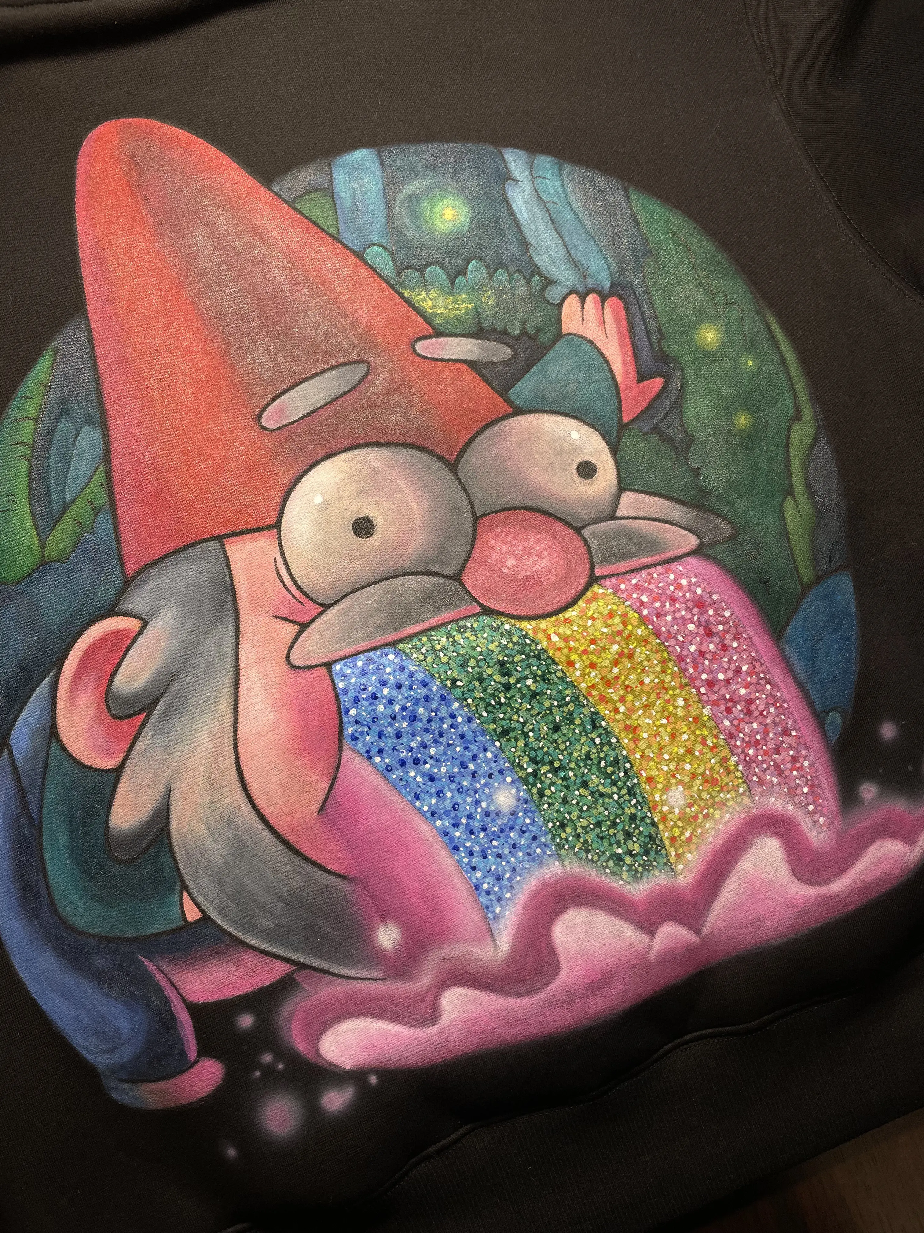 This Gravity Falls–Inspired Painted Hoodie is a high-quality winter fleece hoodie featuring a vibrant, hand-painted cartoon-style artwork inspired by the iconic surreal aesthetic of Gravity Falls. On the back of the hoodie, a colorful gnome character vomiting a rainbow is painted using acrylic paints for textile, covering the entire back. The artwork is bold, expressive, and full of bright colors, creating a playful and eye-catching statement piece. On the front of the hoodie, a triangle-shaped one-eyed character inspired by the infamous Bill Cipher is hand-painted, adding a mysterious and symbolic contrast to the vibrant back artwork. This hoodie is very warm and made from premium-quality fabric, designed specifically for winter wear. The soft fleece interior provides excellent insulation and comfort during cold seasons. Because the artwork is completely hand-painted, each hoodie has its own unique details and slight variations, making every piece one of a kind. This painted hoodie is perfect for fans of Gravity Falls–style art, surreal cartoons, and bold handmade fashion. Key features: • Hand-painted cartoon-inspired artwork on the back • Triangle eye character inspired by Bill Cipher on the front • Acrylic paint on textile • Warm winter fleece hoodie • Unisex fit, US size M • Each piece is unique