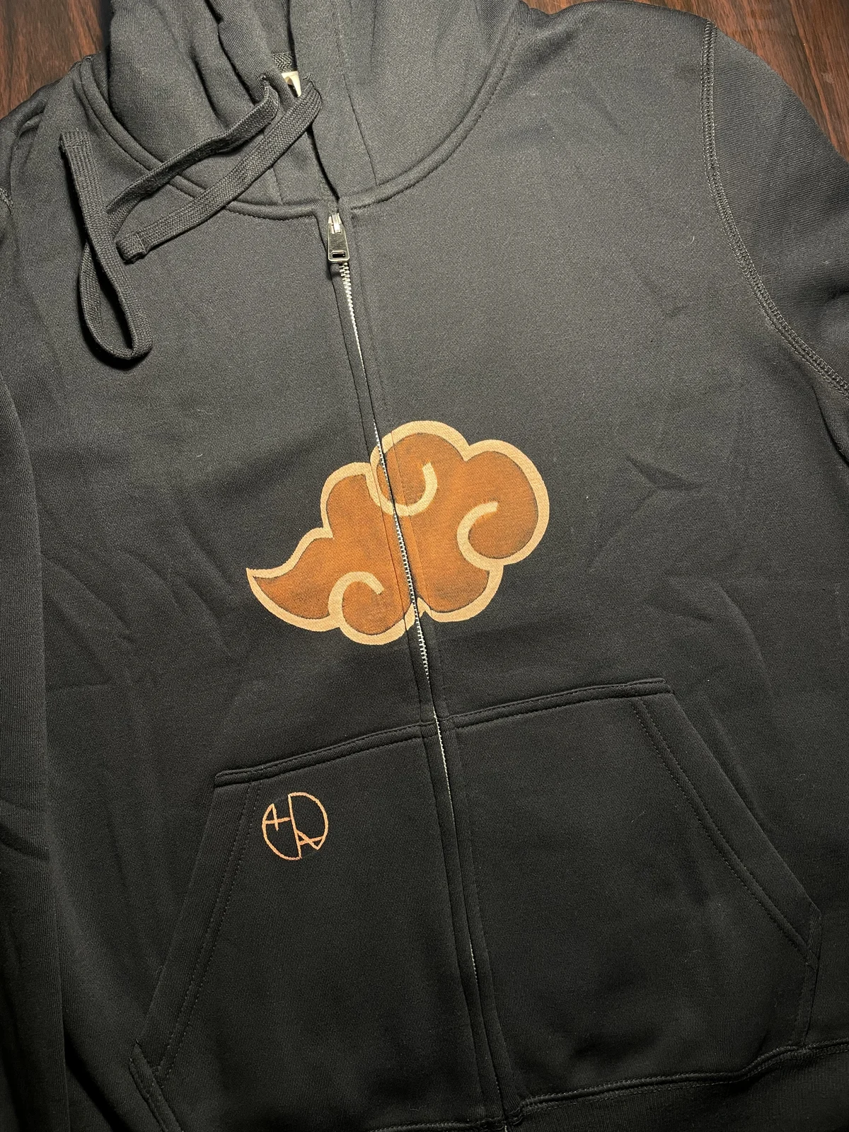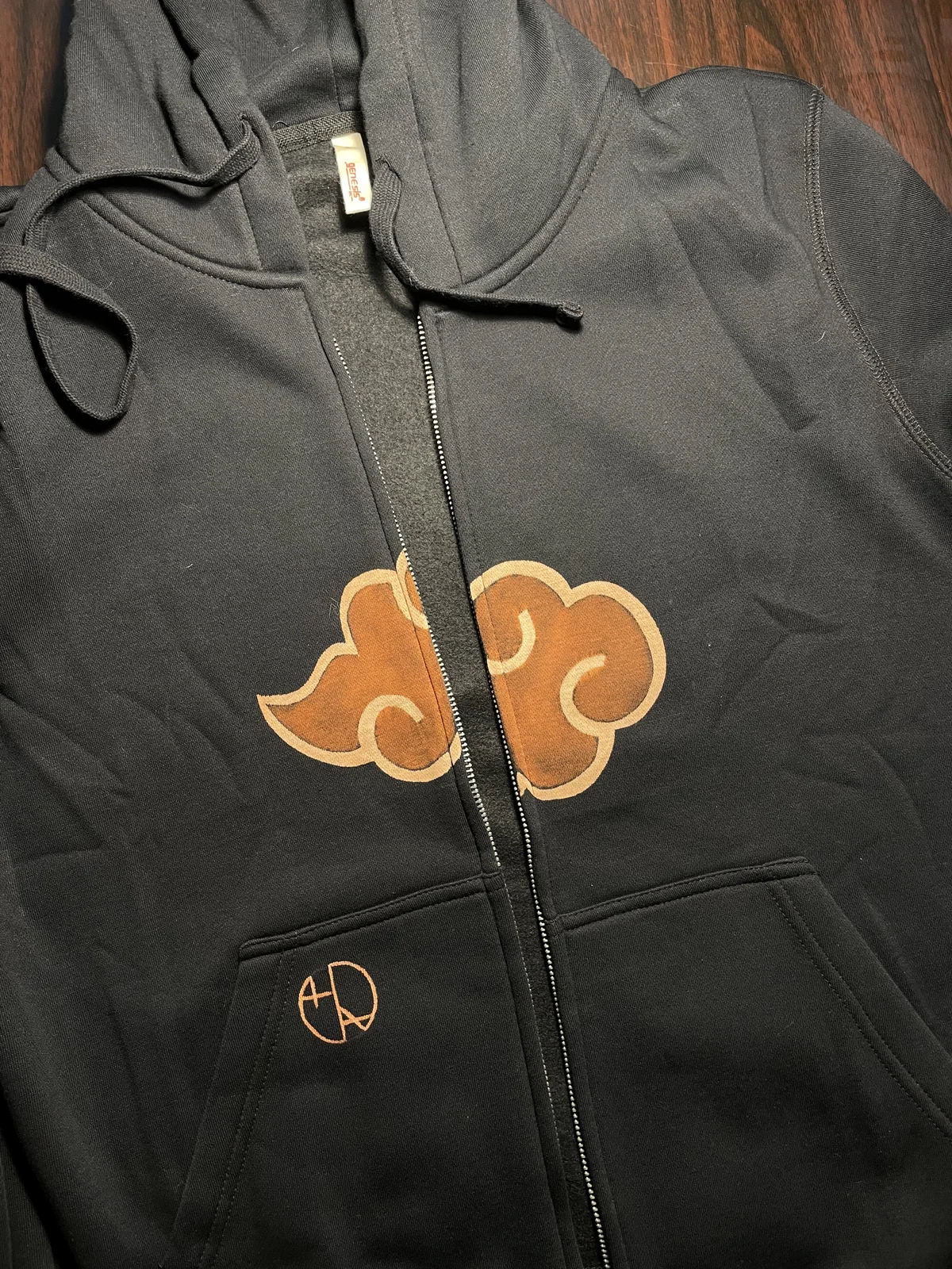 The Itachi Scene Bleach Art Zip Hoodie is a hand-painted fleece hoodie featuring an iconic anime-inspired scene with Itachi, ravens, and Naruto, illustrated across the entire back of the hoodie. The composition captures a dramatic and emotional moment, combining dark atmosphere, movement, and symbolic imagery. The artwork is created using a handmade bleach art technique, allowing high contrast, expressive shadows, and organic textures to emerge directly from the fabric. Unlike printed designs, the illustration becomes part of the hoodie itself, giving it a raw, artistic character. On the front of the hoodie, the Red Clouds emblem is hand-painted and positioned so that the zipper divides the symbol symmetrically into two parts. This creates a striking visual effect both when the hoodie is zipped and unzipped. Additionally, the Helen Oben Art logo is hand-painted on the side of the front pocket, adding a subtle signature detail. The hoodie is made from soft fleece fabric, suitable for spring and autumn wear. The unisex fit in US size L provides comfort, warmth, and a relaxed silhouette. Because each hoodie is painted by hand, slight variations in tone and details may occur. This makes every piece truly one of a kind. This anime-inspired bleach art hoodie is perfect for fans of dark anime aesthetics, expressive storytelling, and handcrafted wearable art.