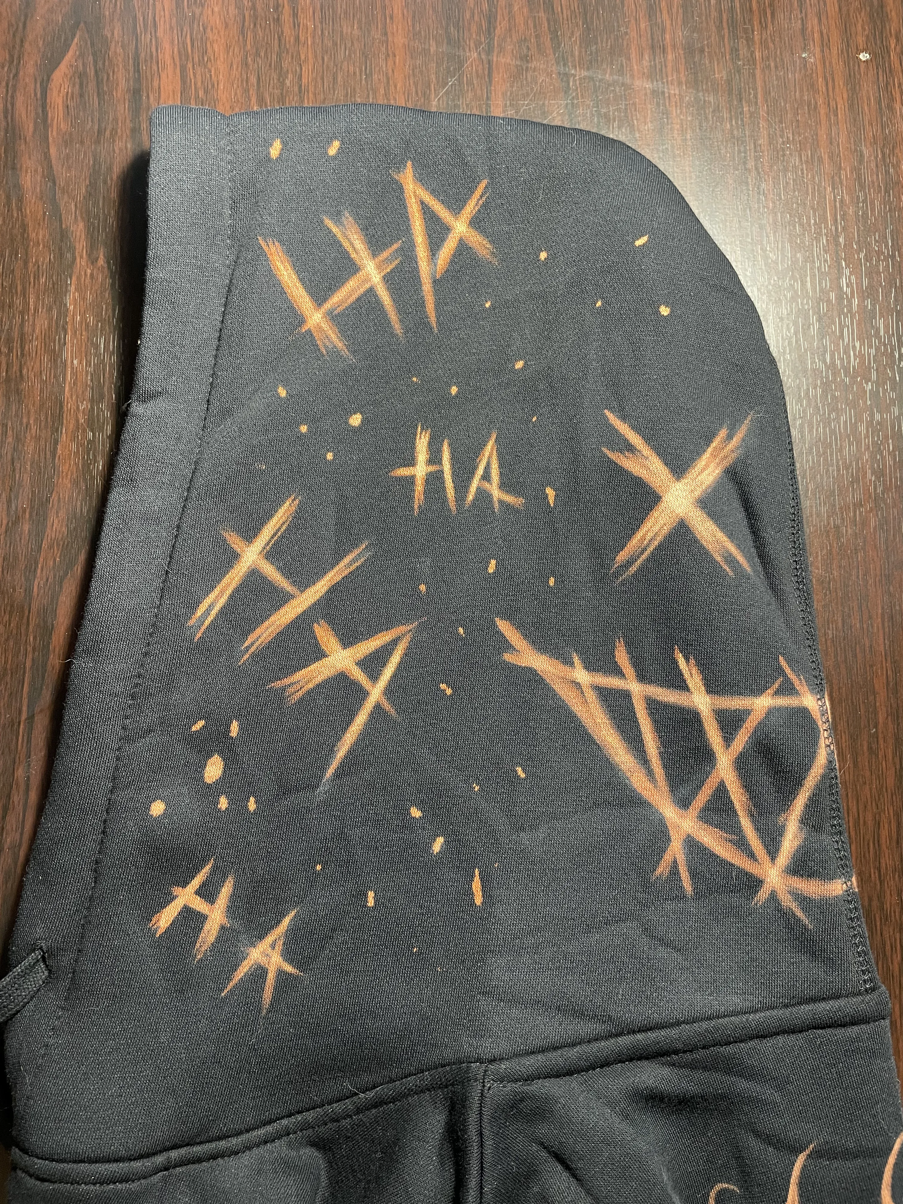 The Joker-Inspired Bleach Art Hoodie is a hand-bleached fleece hoodie featuring a bold clown villain artwork inspired by the Joker, placed on the back of the hoodie. The design is created using a bleach art technique, giving the image high contrast, expressive details, and a raw handcrafted look. The hoodie is made from 80% cotton 20% polyester with a soft fleece lining inside, making it warm, comfortable, and perfect for everyday wear in colder weather. The unisex fit and US size 2XL provide a relaxed, oversized feel. On the hood, the hoodie features hand-painted “HA-HA” lettering, inspired by the chaotic and playful style of the character. On the front side, the hoodie includes my artist logo, subtly placed to balance the bold back artwork. Because each piece is hand-bleached, slight variations in tones and details may occur. This ensures that every hoodie is visually unique. This joker-inspired bleach art hoodie is ideal for fans of dark comic art, villain aesthetics, and bold statement streetwear. Key features: • Hand-bleached clown villain artwork inspired by the Joker on the back • Hand-painted “HA-HA” text on the hood • Artist logo on the front • Warm fleece hoodie, 80% cotton 20% polyester • Unisex fit, US size 2XL • Each piece may slightly vary