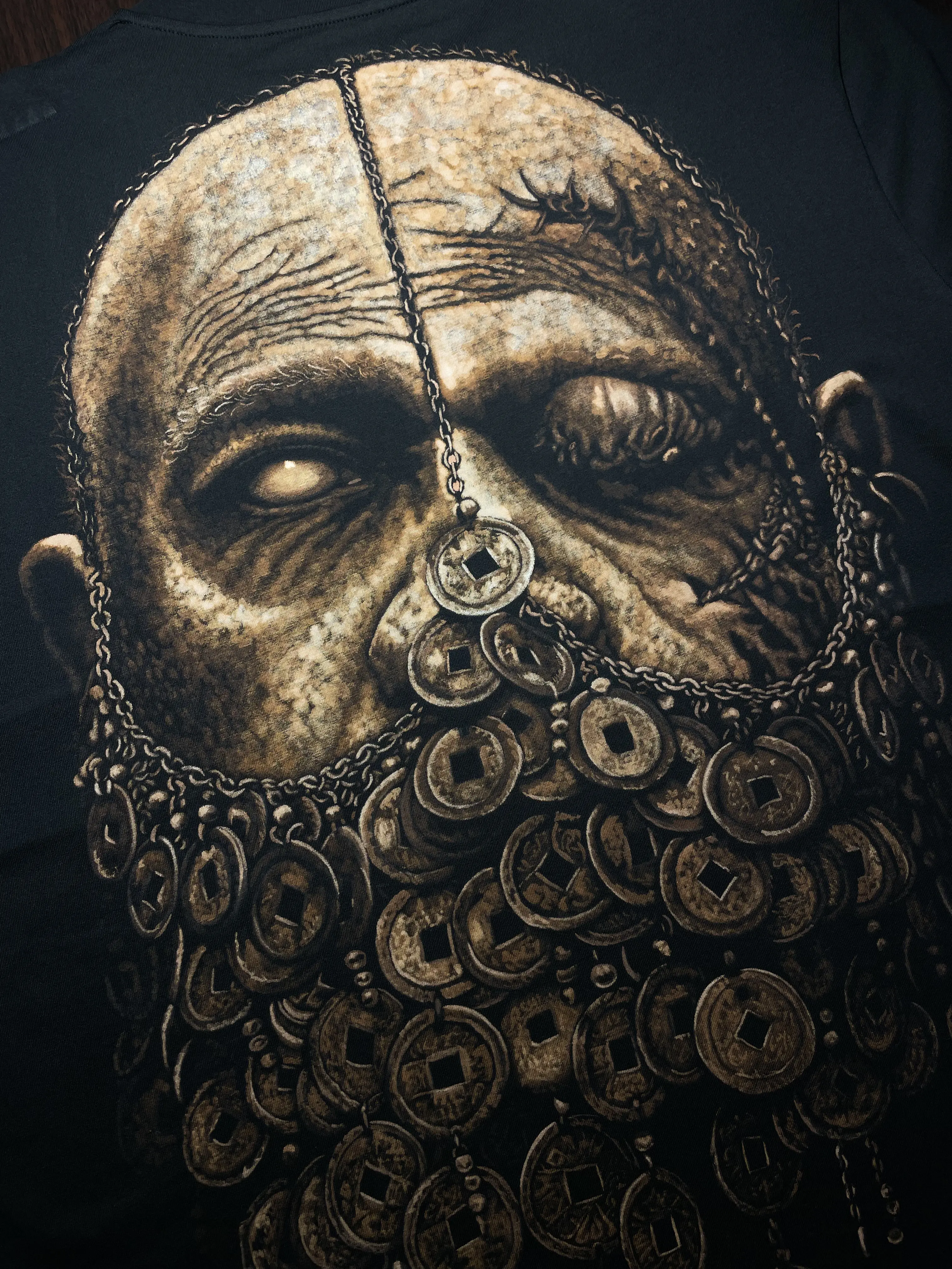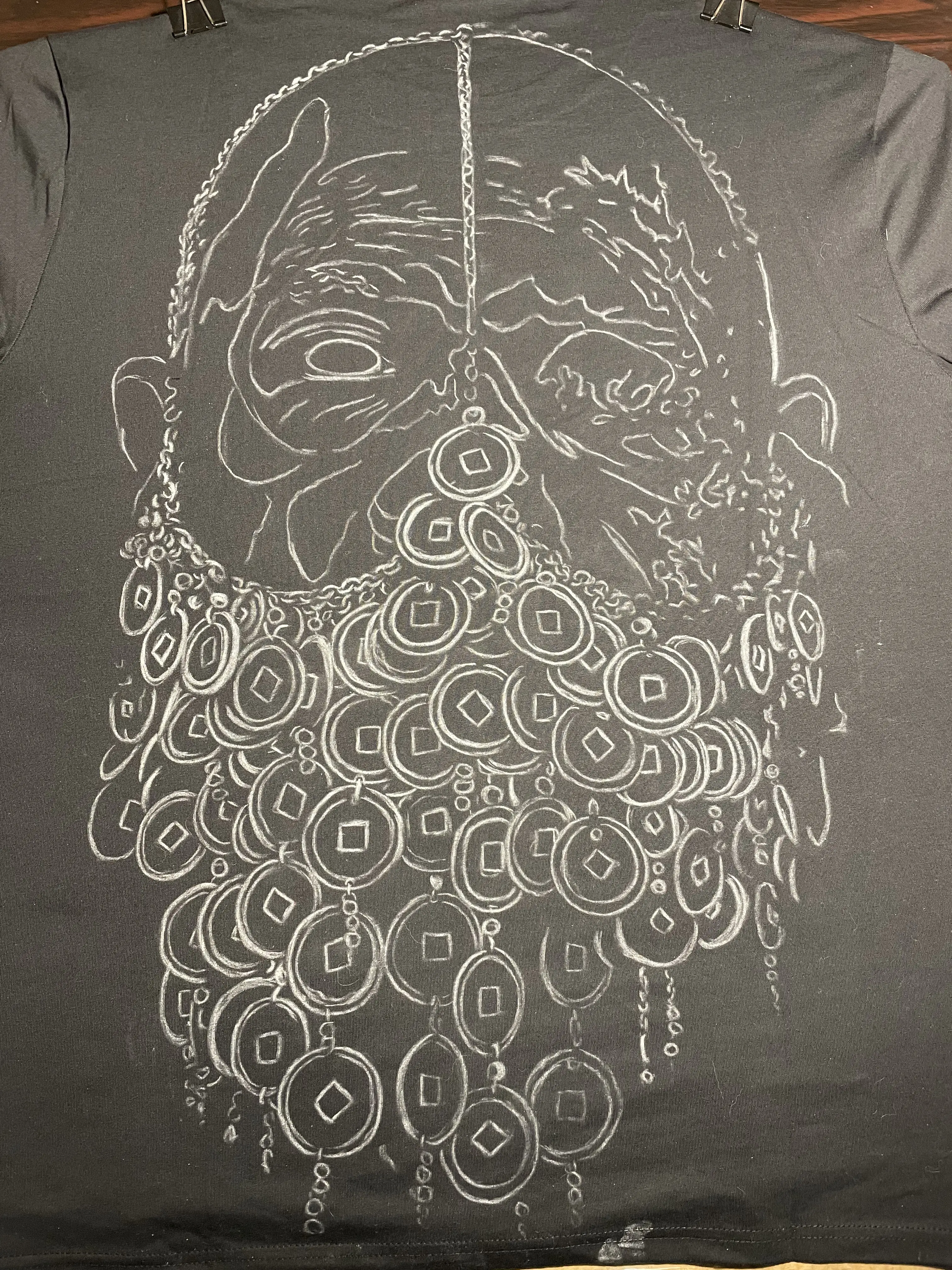 This hand-painted bleach art T-shirt features a dark zombie character inspired by the atmosphere and main figure of the horror film Rigor Mortis (2013). The artwork is painted entirely by hand on the back of the T-shirt, covering the full surface and creating a powerful, cinematic presence. The design is created using a controlled bleach art technique on black cotton fabric, allowing detailed highlights, shadows, and texture to emerge directly from the material itself. No prints, no stencils — each piece is painted freehand and is completely one of a kind. This T-shirt is made for those who appreciate dark aesthetics, horror-inspired wearable art, and handmade clothing with character and depth. Details: • Hand-painted bleach art (no printing) • Zombie artwork inspired by Rigor Mortis (2013) • Full back design • Black cotton T-shirt • Size: 2XL • One-of-a-kind piece