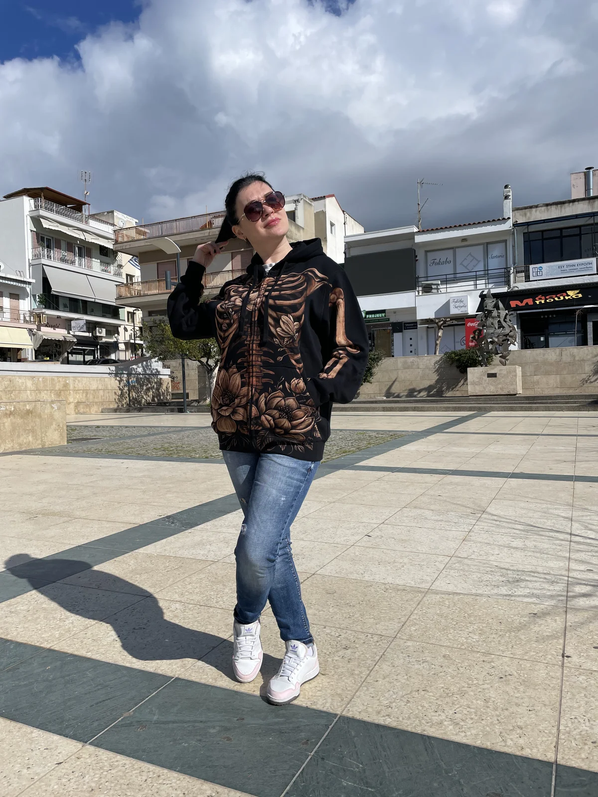 This hand painted zip hoodie features a striking bleach art design of a human skeleton rib cage decorated with magnolia flowers across the entire front. The zipper divides the skeleton symmetrically into two halves, creating a powerful visual effect when worn. The artwork is created by hand using a controlled bleach technique on black fleece fabric, producing high contrast and detailed texture that cannot be achieved with printing. Magnolia flowers soften the anatomical structure, blending dark symbolism with natural elegance. Both sleeves are hand painted with arm bone details, completing the full-body composition and enhancing the dramatic impact of the design. Designed for spring and autumn, this fleece zip hoodie combines comfort, warmth, and bold artistic expression. Each piece is individually hand painted, making it one of a kind. This is not printed clothing — it is wearable art. Details: • Hand painted bleach art zip hoodie • Skeleton rib cage design on full front • Magnolia flowers integrated into the artwork • Arm bone details on sleeves • Front zipper dividing the skeleton symmetrically • Fleece hoodie (spring / autumn) • Size: L • One-of-a-kind piece