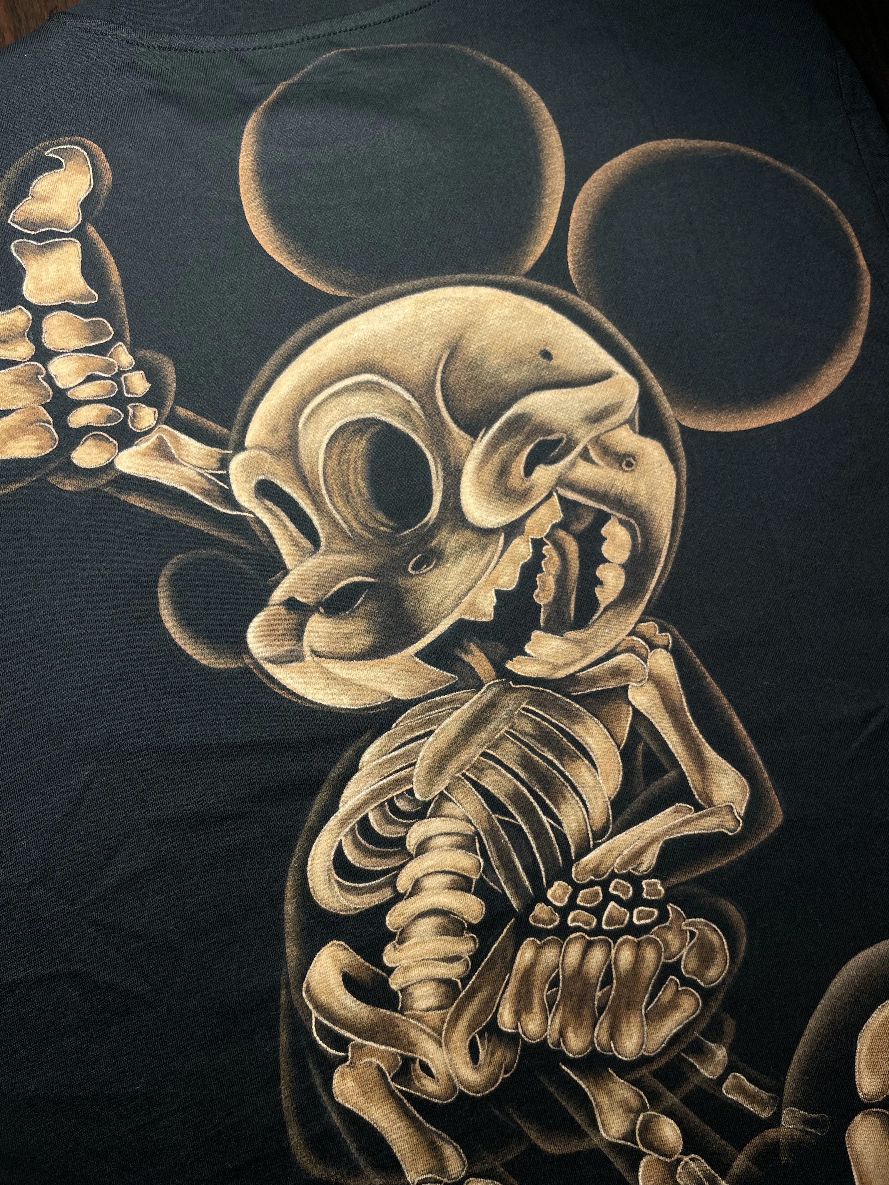 The Skeleton Mouse Bleach Art T-Shirt is a hand-bleached cotton t-shirt featuring a detailed skeleton mouse artwork, created in an x-ray–style illustration, placed on the back of the t-shirt. The design is inspired by Mickey Mouse from classic cartoon imagery, reimagined through a dark, skeletal lens that transforms a familiar pop culture icon into an expressive gothic art piece. The artwork is created using a handmade bleach painting technique, producing strong contrast, sharp skeletal details, and a raw handcrafted texture that clearly stands apart from printed graphics. The x-ray-inspired aesthetic gives the design a haunting, medical-style look while maintaining a recognizable cartoon silhouette. On the front side, the t-shirt features my artist logo, clean and minimal, designed to balance the detailed back artwork without overpowering it. Made from 100% cotton (270 gsm), this t-shirt feels soft, breathable, and durable, making it suitable for everyday wear. The unisex fit and US size XL offer a comfortable, relaxed silhouette. Because each piece is hand-bleached, slight variations in tones, contrast, and skeletal details may occur. This ensures that every t-shirt is visually unique. This skeleton mouse t-shirt is perfect for fans of dark pop art, x-ray illustration, skeleton artwork, and handmade statement clothing inspired by classic animation.