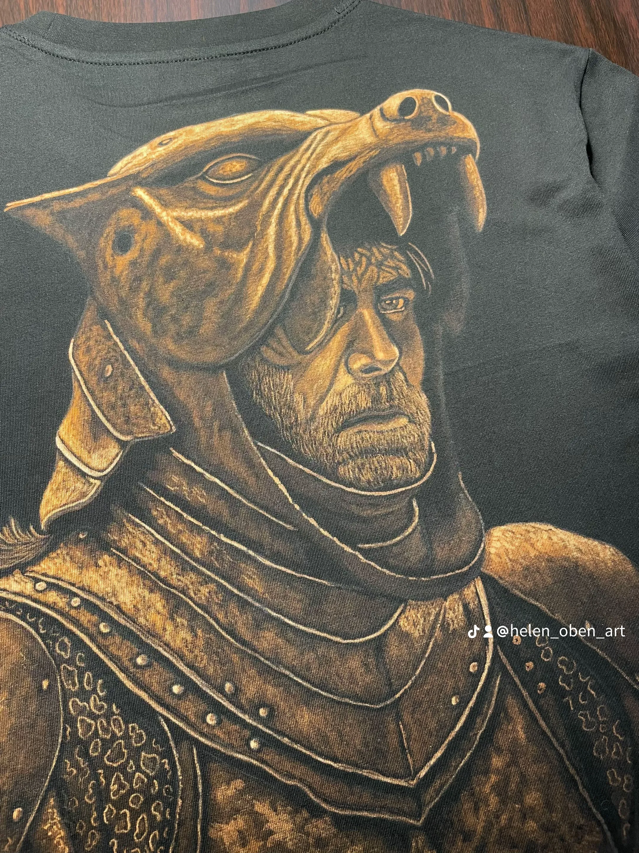 The Hound Bleach Art T-Shirt is a hand-bleached cotton t-shirt inspired by The Hound from Game of Thrones. The detailed character artwork is placed on the back of the t-shirt, created using a bleach art technique that delivers strong contrast, depth, and a raw, expressive handmade look. On the front side, the t-shirt features my artist logo, along with the “Game of Thrones” text, carefully integrated to balance the bold back artwork while keeping the design cohesive. Made from 100% cotton (270 gsm), this t-shirt is durable, breathable, and comfortable for everyday wear. The unisex fit and US size XL provide a relaxed silhouette suitable for casual and streetwear styling. Because each piece is hand-bleached, slight variations in tones and details may occur. This ensures that every t-shirt remains visually unique, even when the same design is recreated. This bleach art t-shirt inspired by Game of Thrones is ideal for fans of dark fantasy, strong characters, and handcrafted statement clothing. Key features: • Hand-bleached artwork inspired by The Hound on the back • Artist logo and “Game of Thrones” text on the front • 100% cotton, 270 gsm • Unisex fit, US size XL • Handmade bleach art technique • Each piece may slightly vary